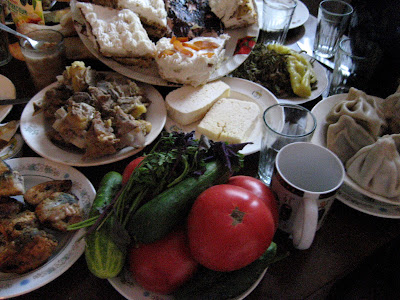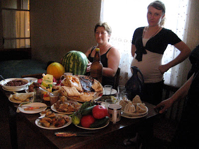 We didn't walk far before getting to Nino's parent's homestead, where Nino's sister, Maia, lives. Forty days ago, their mother had died, and this get-together was a customary gathering that occurs 40 days after the loved one's death. It marks an end to a period of mourning. (I seem to recall Ayano, of the Bale Mountains in Ethiopia, telling me of a similar process. Once the 40-day mark occurs, the next and final note of the mourning is the first year's anniversary of the loved one's death. I wonder if the same happens in Georgia.)