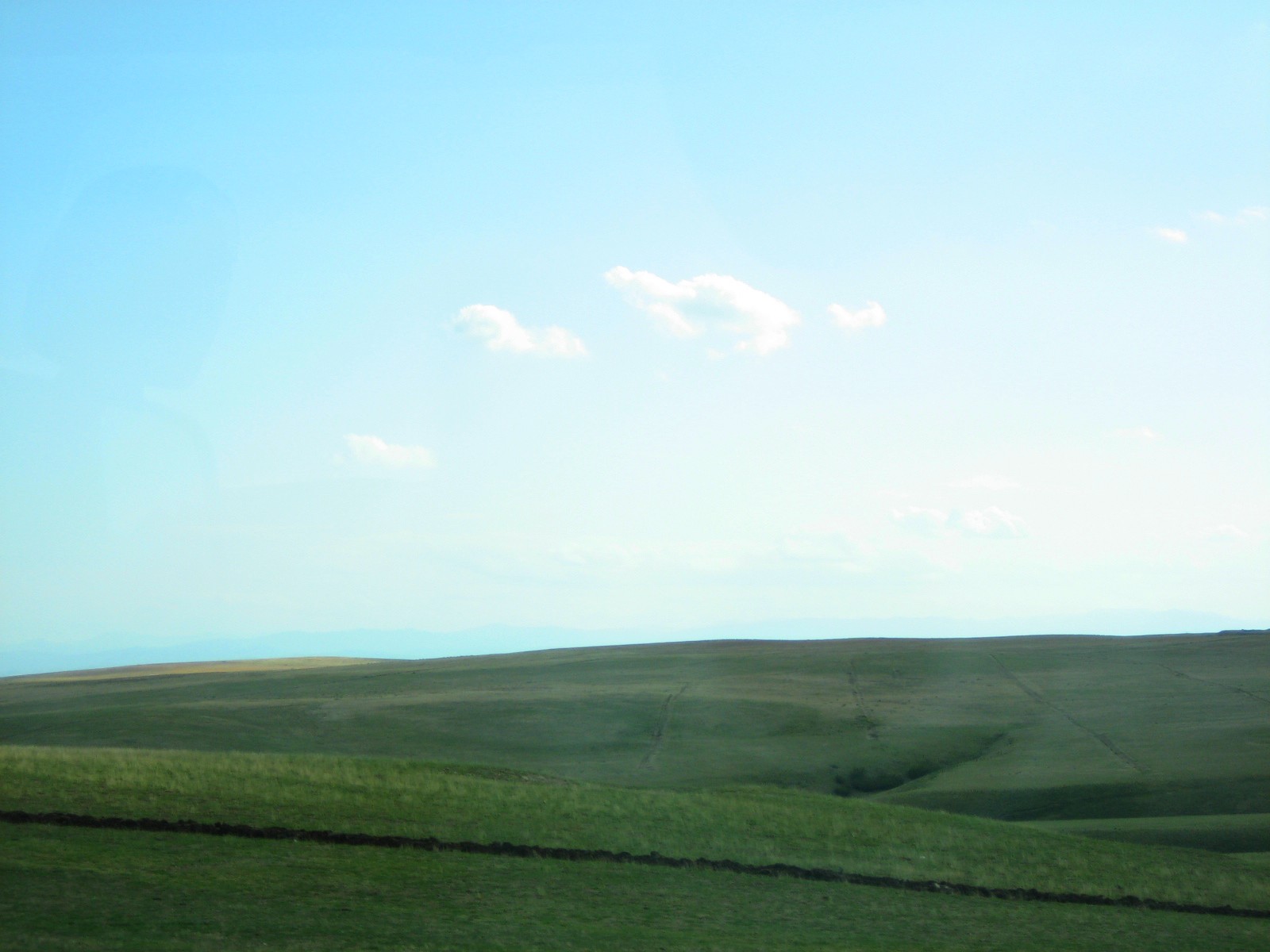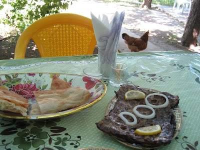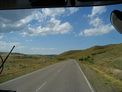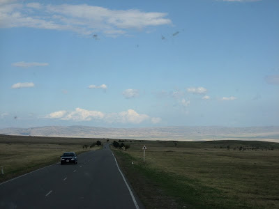 The driver did appear and we took off. Damn, it was nice to see a new view of Georgia! Rolling, treeless hills, the foothills of a nearby mountain range. Hills and sky. Eventually, I saw a sign that said Keshalo -- ah, the town! .... we passed a little roadside cafe, then another, and another ... and the town? Well, there were some houses off the road, but .... hey, driver, Rami's. No response. To the driver, Rami's. No response. I tapped the shoulder of the young guy sitting next to the driver. Rami's.