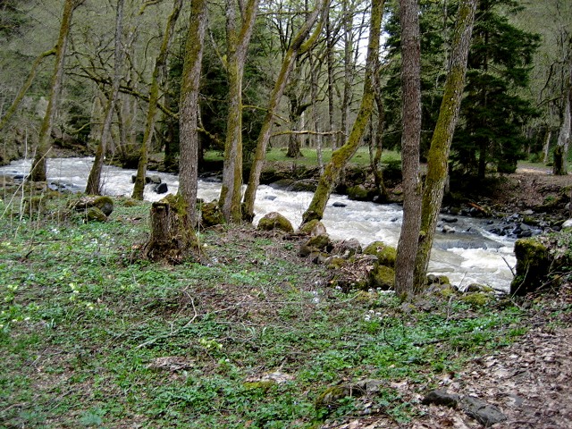 This was my kind of place: Trees, a river, spring flowers, mossy bark, cool woodland breeze, birdsong, piney scents. There was no one else around.